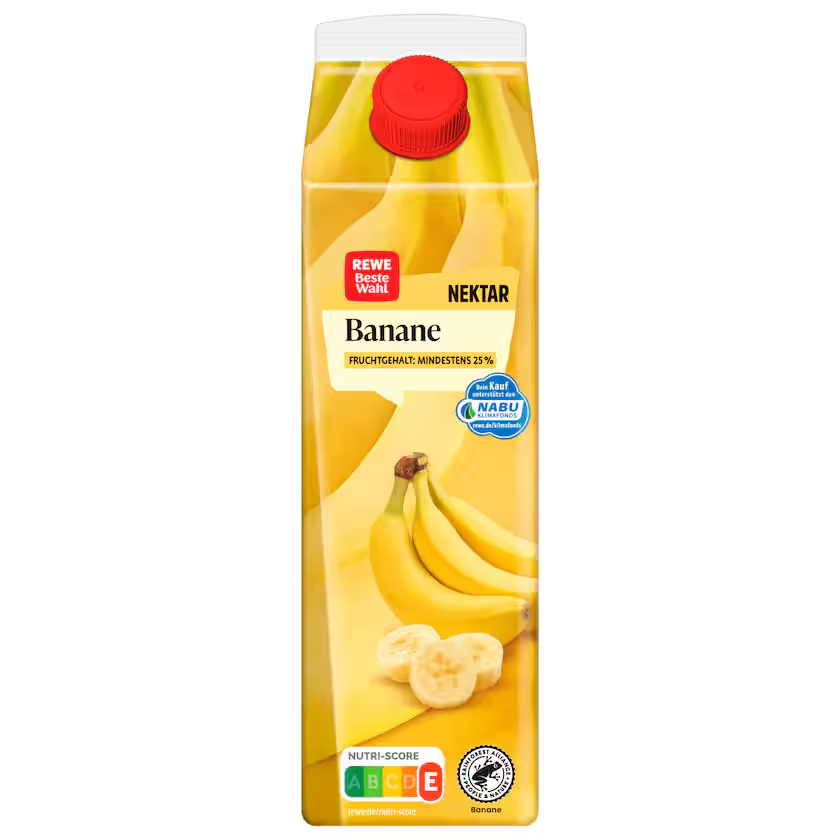 Unser REWE Beste Wahl Bananen Nektar garantiert Ihnen einen unwiderstehlich fruchtigen Genuss. Erleben Sie unsere leckere Erfrischung aus besten, erlesenen Früchten. Hergestellt für: REWE Markt GmbH, D-50603 Köln.