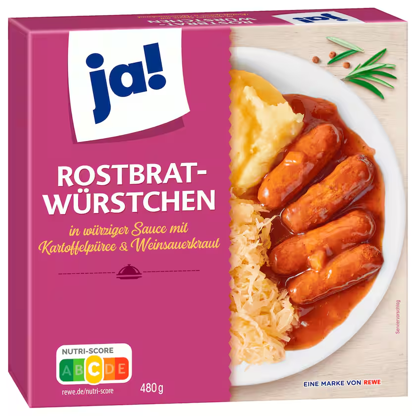ja! Rostbratwürstchen in würziger Sauce mit Kartoffelpüree und Weinsauerkraut 480g