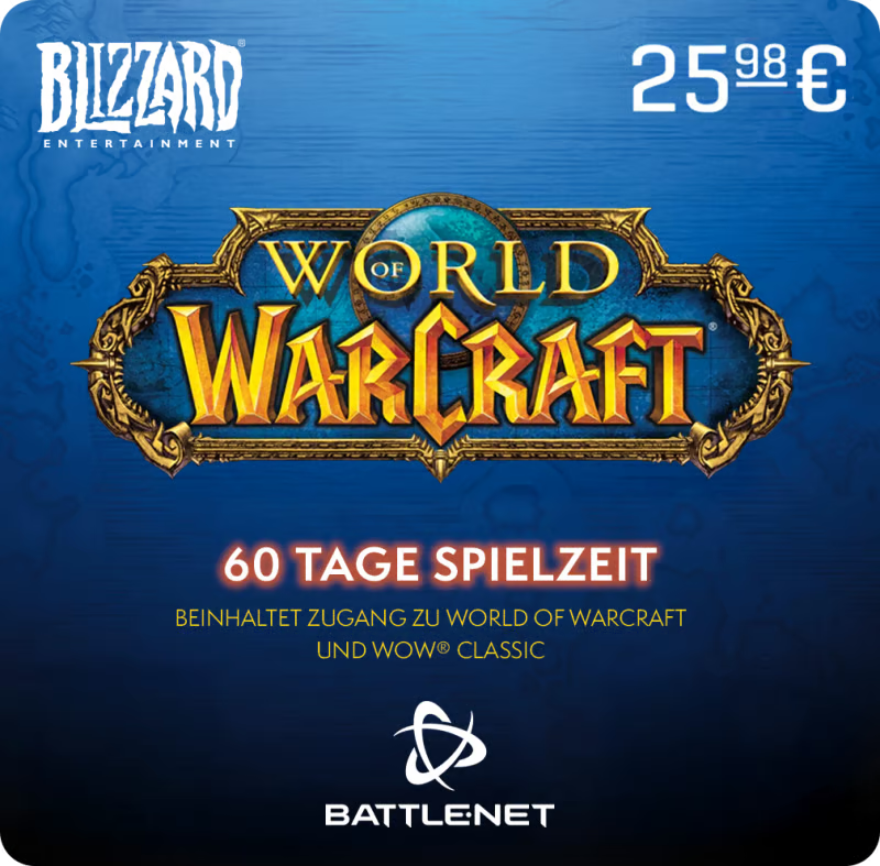 Mit der WoW Karte kannst du 60 Tage in der Welt von Azeroth genießen. So musst du dir zwei volle Monate keine Gedanken über dein Konto machen! Kaufe jetzt die WoW Guthabenkarte bei BackKiosk und lade dein WoW-Konto wieder auf.
